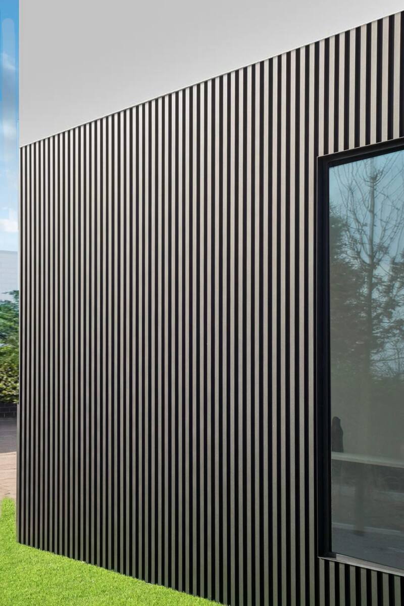 While many exterior panels look artificial or require constant upkeep, this wood-effect panel delivers the natural look of wood without the downsides. Its slatted form creates visual interest and airflow, while wood tone blends seamlessly with both modern and traditional architecture